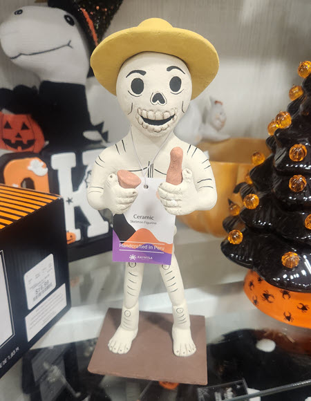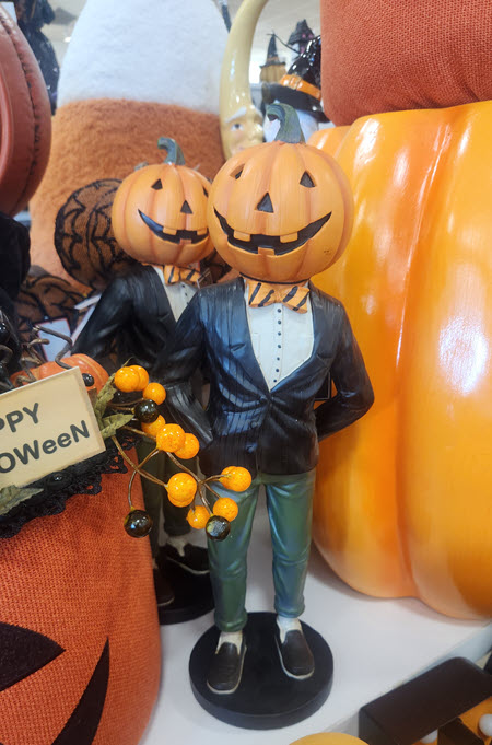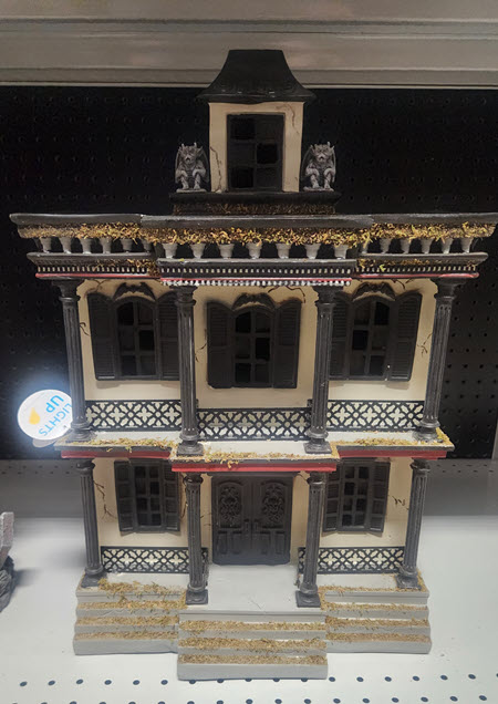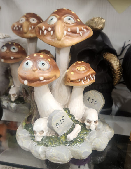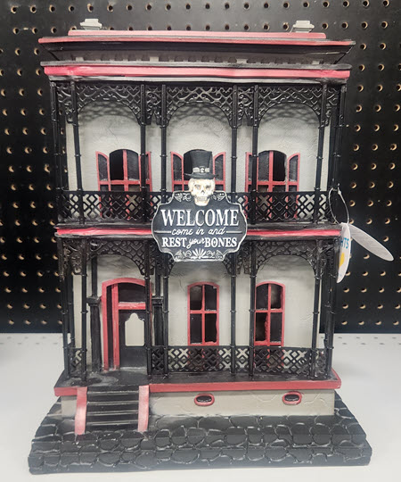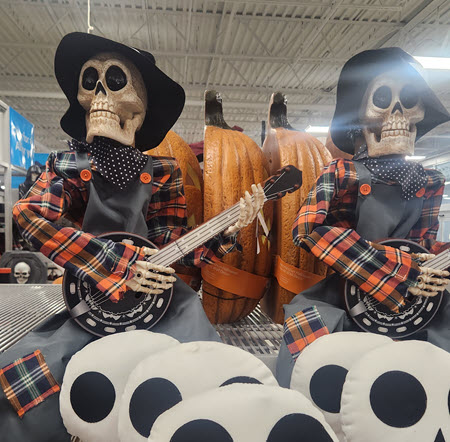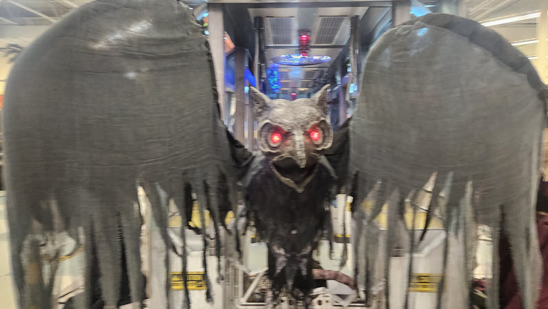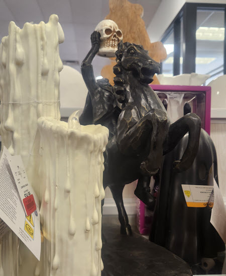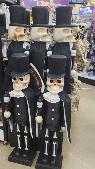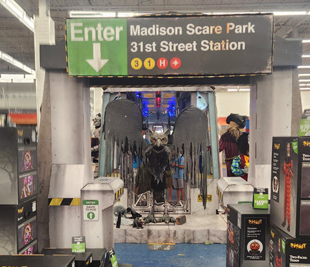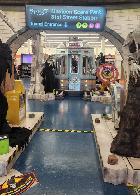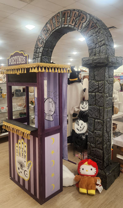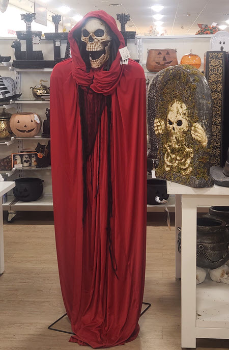 You walk into what looks like a huge spooky decoration store. In the corner, a skeleton prop sits at a register, covered in cobwebs.
